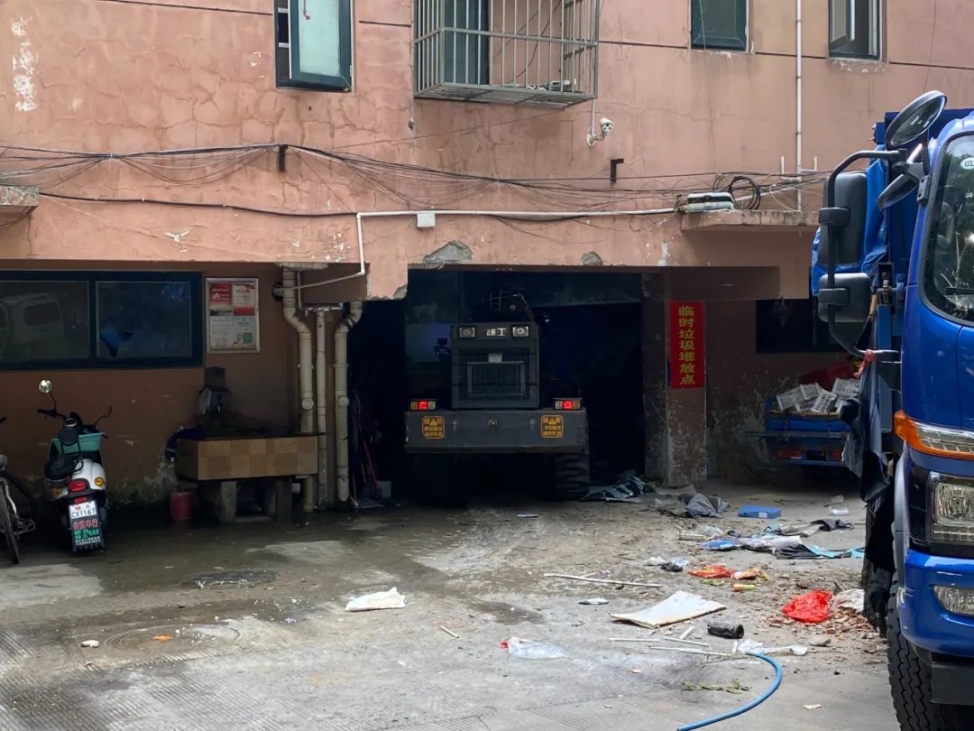 In the Hanlin Yaju Community, there is a construction garbage stacking point on the first floor of the room full of garbage, exuding an unpleasant smell. At the scene, a forklift was transporting the garbage to the truck, and soon it was filled with a car.