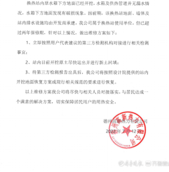 "Everyone discusses the principle of solving problems for residents, how to solve the problem of water seepage of the basement." Mr. He, a resident representative of Building 2, said that in the early stage, the staff of the Texas High -tech Heating Co., Ltd. demolished the water -changing water tank and emptied water tanks and empty -emptying. After the water of the heating pipeline, the ground was dug, and the reason why the basement was still infiltrated. At present, there are still a small amount of water after pumping in the deep pits of the heat exchange station, but there is still a small amount of water, but the accumulated water no longer rises. Residents have two demands: requiring the phenomenon of water seepage to repair; safety testing of the water -changing station water seepage area to ensure the foundation of the residential building.