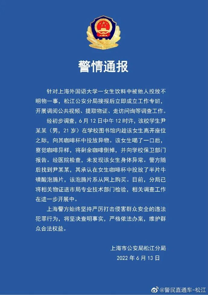On the 13th, the Songjiang Branch of the Shanghai Public Security Bureau reported that after inspection by the hospital, no girl's body was abnormal. Police then found Yin Moumou, who admitted to putting half a piece of taurine foaming tablets in the girl coffee cup, which was purchased from the Internet. At present, the branch bureau has sent relevant physical evidence to the professional technical department of the Municipal Bureau for inspection, and the relevant investigation work is under further development.