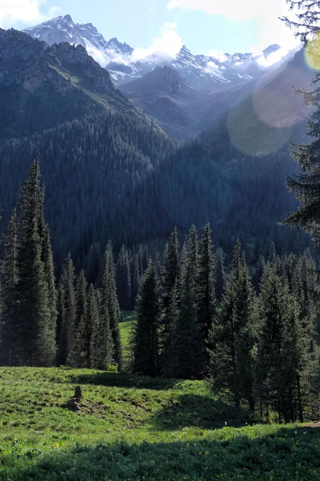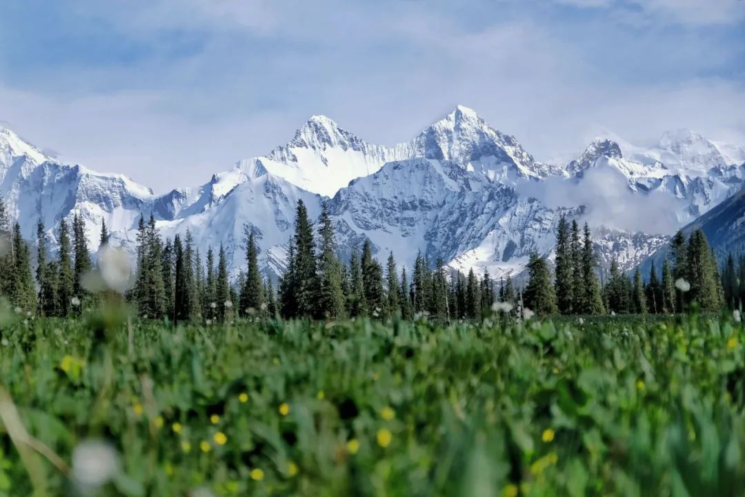 The Xiata Ancient Road is a place where hiking enthusiasts like very much. The blue sky and white clouds, forest streams, and grassland wild flowers. The Muzart Glacier is shining in the sun. The fat mansion exposes the brain in the grass from time to time, giving an extra surprise .. ....